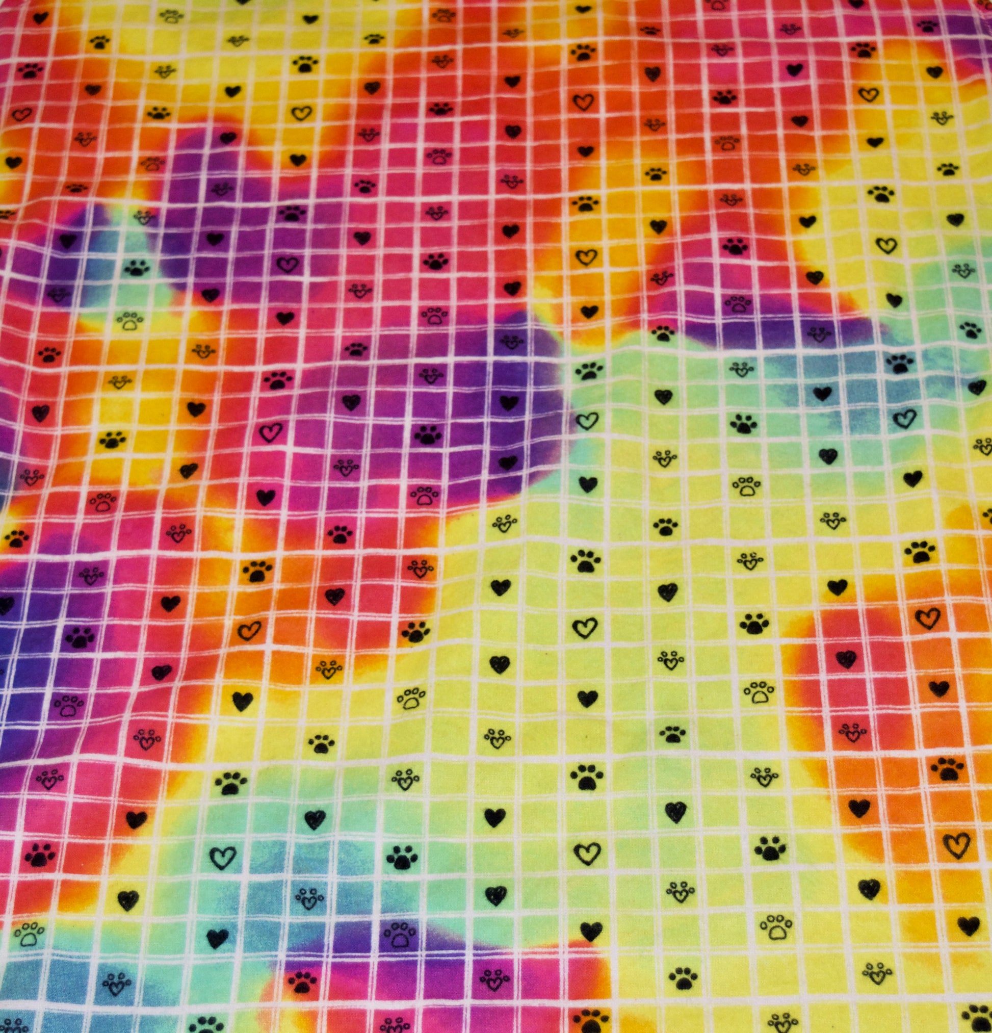 Bright tie dye pattern with tiny paw prints and hearts scattered about on 100% cotton flannel backed with a pretty bubblegum pink bumpy minky.